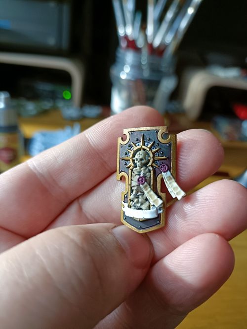 - Purity Seals (Ribbon): AK Interactive Off-White, Vallejo Xpress Colour Mummy Wash (1:1 mix with water), Chaos Black (writing), Sepia ink wash