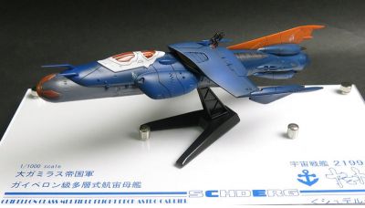 One of the four Garmillas space carrier models from the Yamato 2199 series. There are two other similar carriers to this one - the green "Balgray", and the purple "Lambea", both of which are more or less identical - other than the fighters they carry. There's also the combination battleship/carrier "Darold".